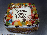 ‘’Standaard’’ taart die wij versieren met kauwgom bal figuurtjes, kleine marsepeinen beestjes, vlaggetjes, confetti.